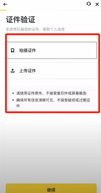 在币安官网注册之后,他会直接给我们跳转到了身份认证的页面。我们先选择一下我们的居住国家和地区,以及证件签发国家和地区。然后选择一下我们想要用来认证的证件类型,我这里就选择“身份证”,点击【继续】。