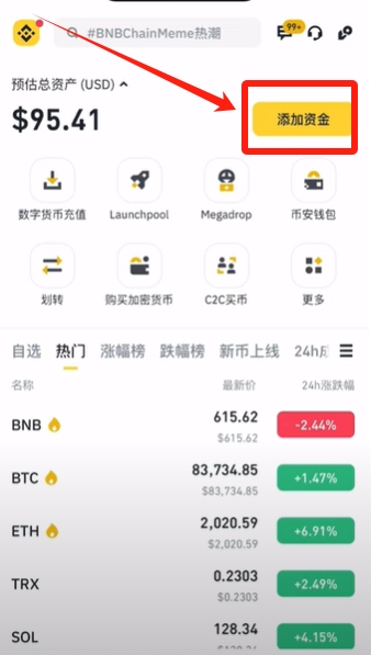 身份认证成功之后,我们就可以去自由的使用币安的各种交易功能了,接下来我们就可以去进行入金了,我们在首页这里点击【添加资金】。