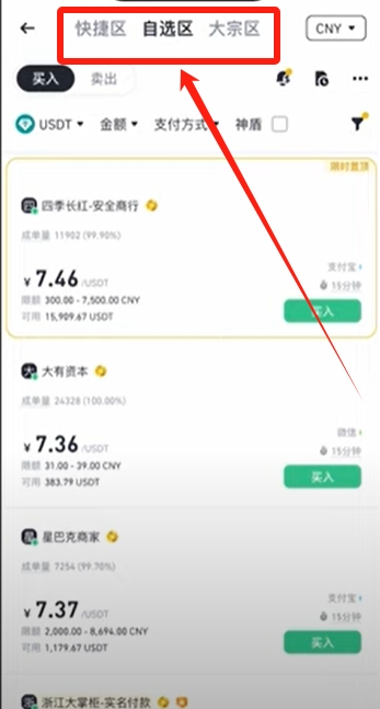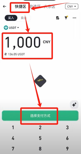 自选区还有大宗区它是很类似的,区别就是大宗区是针对于大额的交易。如果我们想进行小额的入金的话,直接快捷区就可以了,它是非常方便的。我们只需要输入我们想要购买的金额,比如说我这里想购买1000人民币的USDT,点击【选择支付方式】。