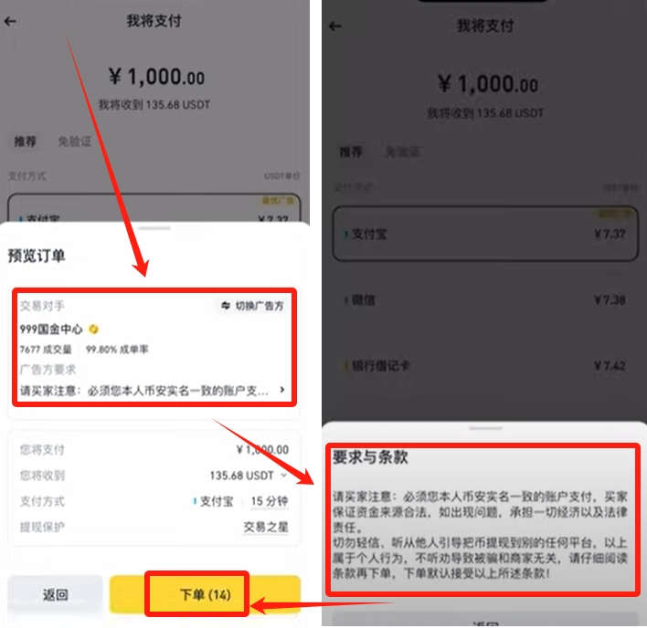 这里就给我们匹配了一个商家,你有30秒的时间尅考虑是否跟他交易。我们可以看一下他的成交量和成交率,如果还比较高我们就可以去跟他交易。顺便我们再看一下广告方的要求,比如说实名支付,不要备注等等。如果能接受,我们就可以跟他交易,点击【下单】。