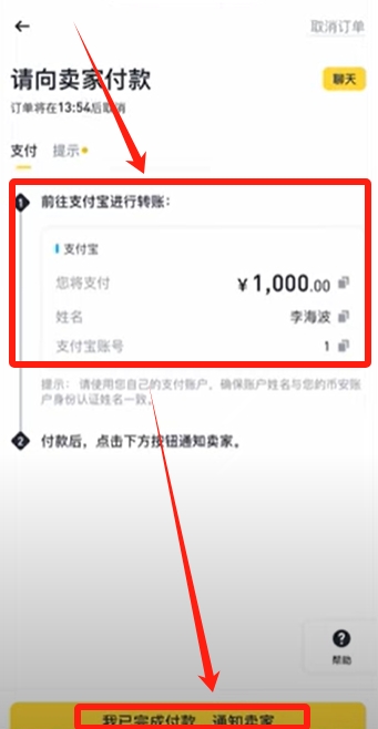 这个时候商家的姓名还有支付宝账号都给我们显示出来,没显示的也可以在聊天框里面去领取。这个时候我们就可以离开平台,去到支付宝里面根据卖家的要求去给他汇款了,转账完成之后再点击【我已完成付款,通知卖家】。然后等待卖家给我们放币就可以了,几分钟左右我们的USDT就能到账了。