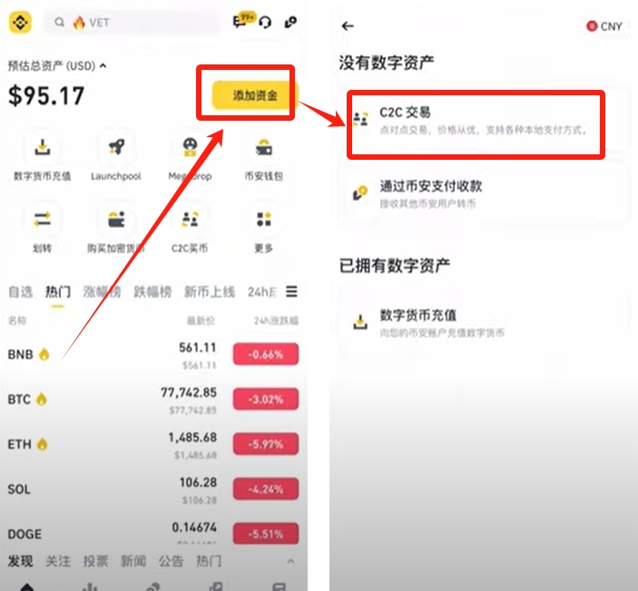如果你赚到钱了想要出金的话,我们也是在首页的【添加资金】这里,选择【C2C交易】。