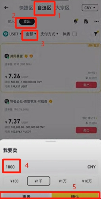 只不过出金就不建议大家再使用快捷区了,我们最好在自选区自行去选择一个靠谱的商家去跟他交易。 我们选择【卖出】,然后金额这里我们也可以筛选一下,比如说我要卖1000人民币的USDT,点击【确认】。