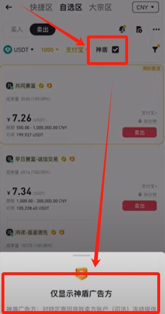 然后神盾这里我们把它勾选上,这是币安特有的一个保障。也就是说如果我们跟神盾商家进行交易,导致我们账户里面的资金出现了一些问题,比如说被风控了,那么我们就可以得到一定的赔偿的。所以神盾商家也是更靠谱的一类的商家。