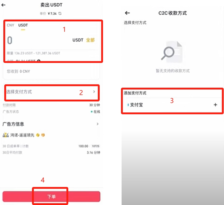 输入我们想要卖出的数量,你是想卖出多少钱的USDT,还是想卖出多少个USDT,可以自由的选择。这里也可以选择收款方式,添加上我们的支付宝,点击【下单】,卖家就会往我们的支付宝账户里面打钱了。