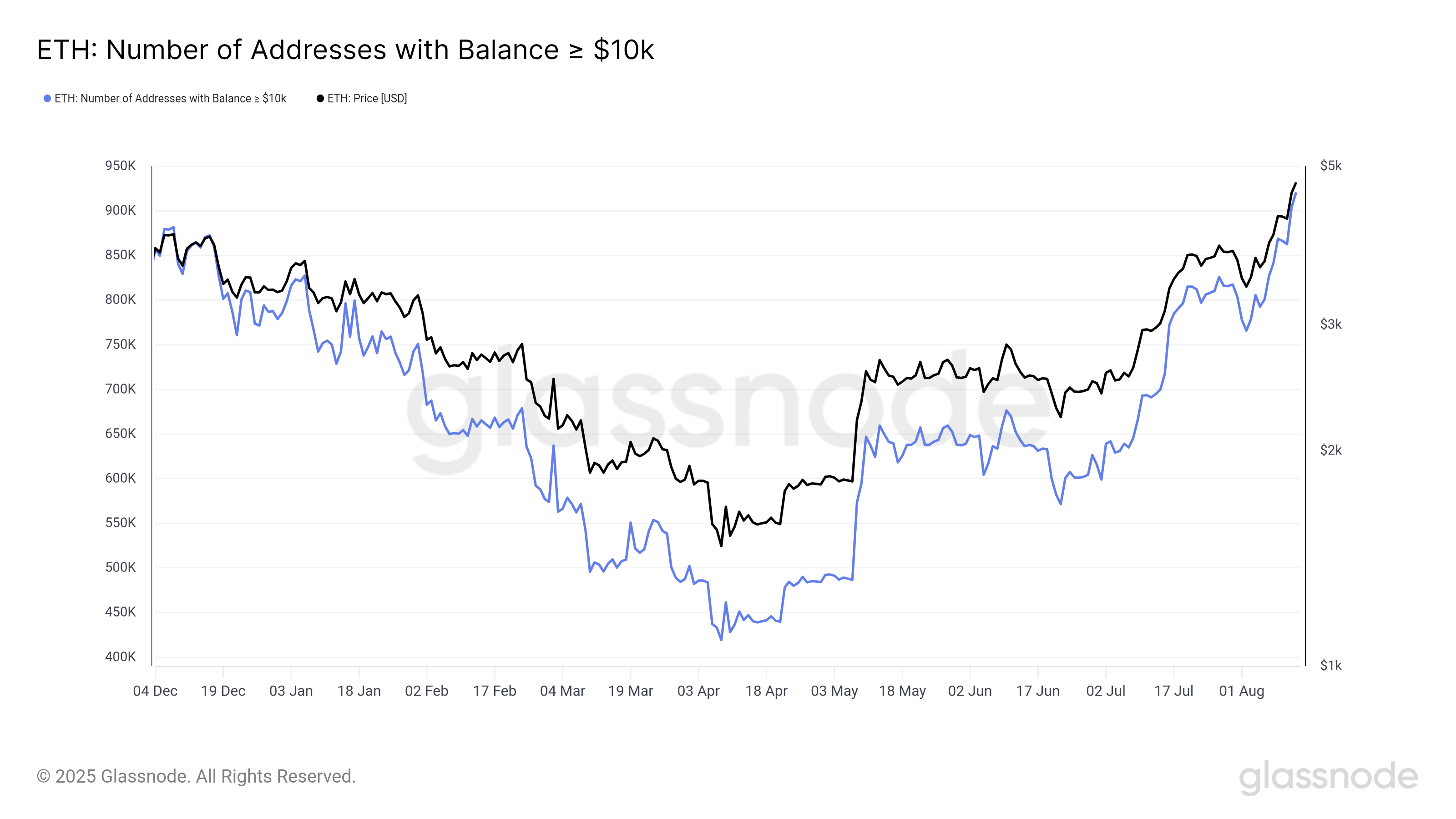 持币群体的强力支撑正巩固以太坊价格的上涨势头。数据显示,持有超1万美元ETH的地址数量激增,目前已突破92万个,创下年初以来最高纪录。