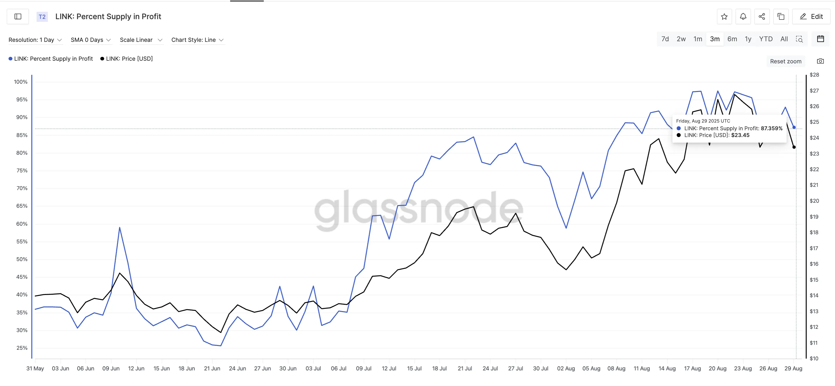 最明显的信号之一是LINK处于盈利状态的供应量占比仍徘徊在历史高位。截至8月29日,近87.4%的流通供应处于盈利状态,接近8月20日创下的近期峰值97.5%。该峰值出现时,LINK价格曾冲高至26.45美元,次日便快速回调6%至24.82美元。