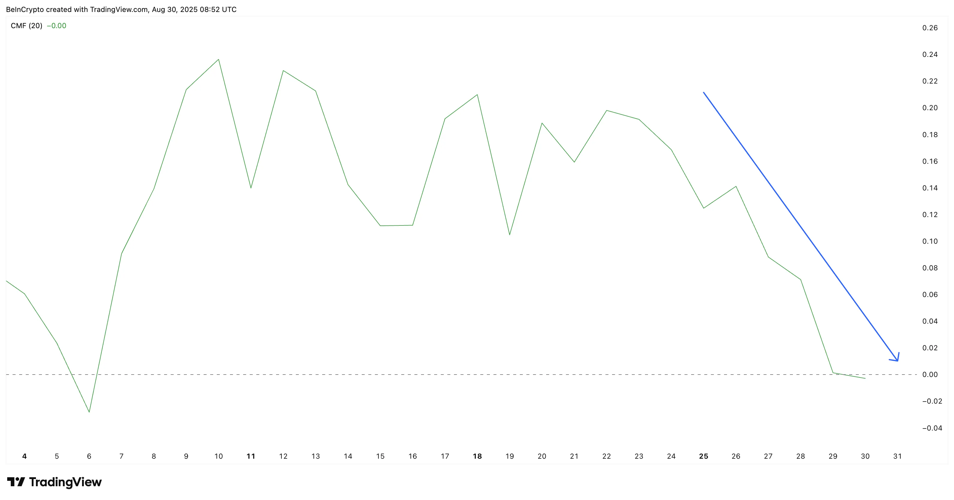 此外,追踪资金流入/流出的Chaikin资金流量指标(CMF)自8月22日持续走低,并于8月29日跌破零轴,为8月6日以来首次。该指标转负意味着买盘压力和资金流入正在消退,进一步强化回调可能性。