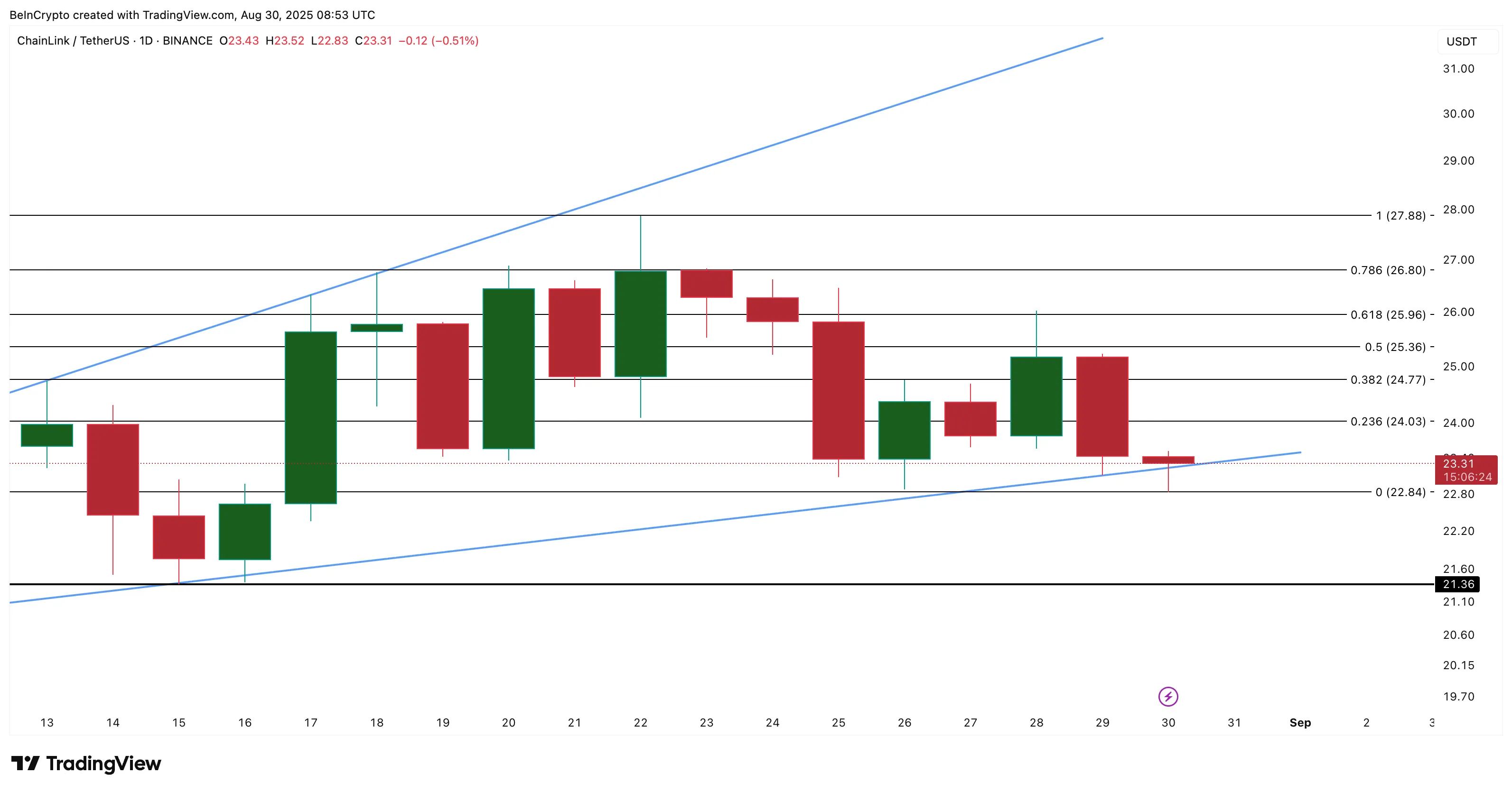 日线图强化了警惕信号。当前LINK报价23.31美元,正处于上升扩散楔形形态内——这种结构通常出现在牛市阶段末期,预示上行动能衰竭。此类"喇叭形"形态以触发熊市反转著称,LINK目前正面临这一风险。