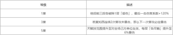 技能描述:每次造成暴击伤害后,300范围内己方单位,获得增益「各尽觞」,提升4%暴击伤害,持续10秒,上限8层。