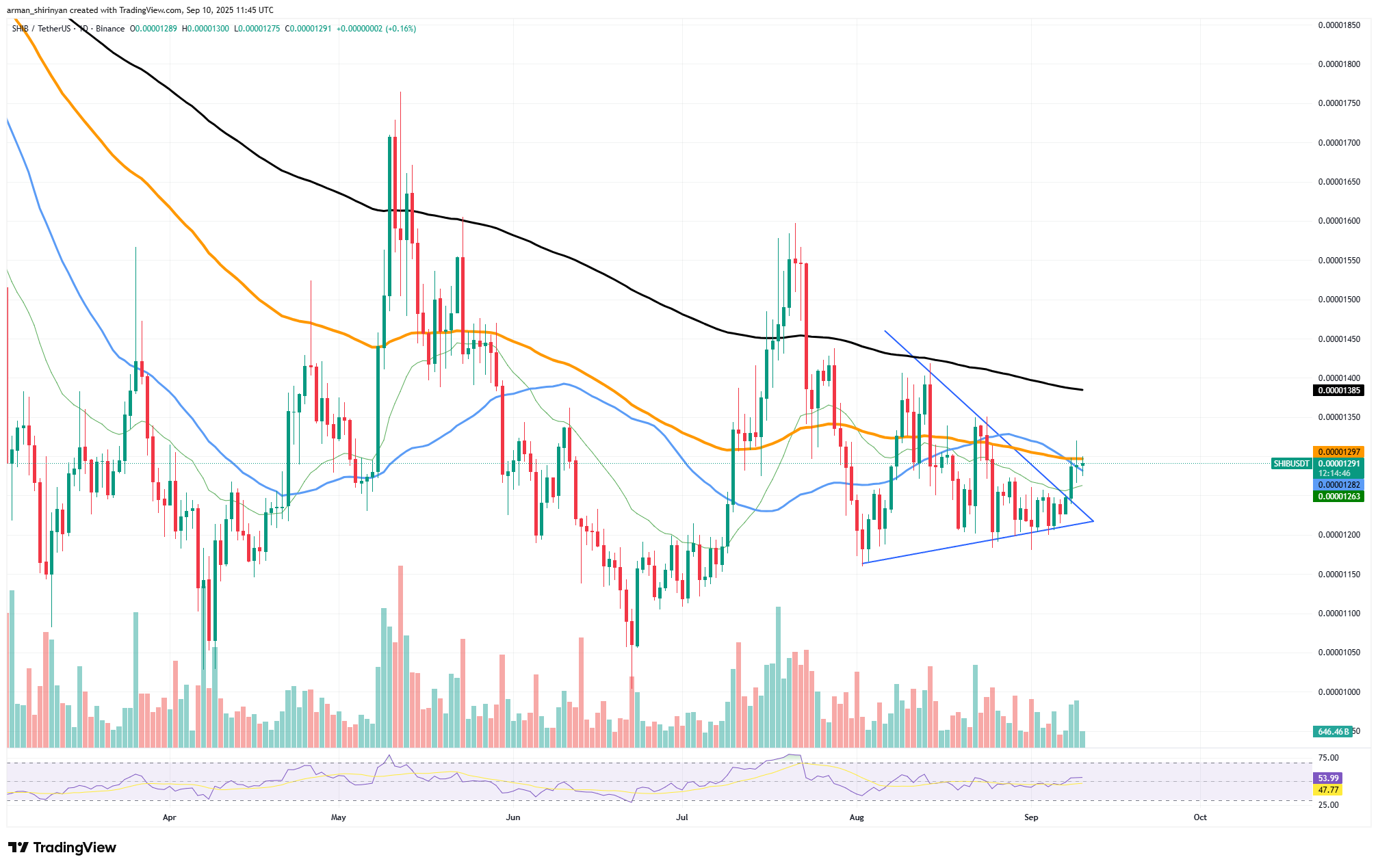 从SHIB/USDT图表来看,价格在突破三角形整理形态后,目前正测试0.0000130-0.0000138美元区间的阻力位。均线紧密聚合暗示可能的突破形态。若价格能强势站上200日均线(EMA),尤其是伴随成交量放大,或将引发强劲的趋势延续。
