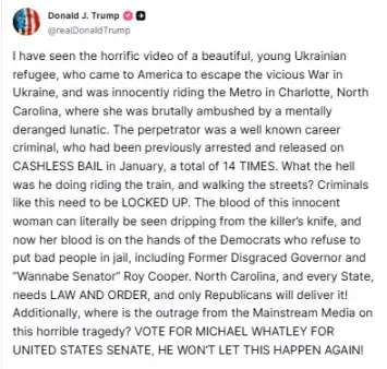 川普还在 Truth Social 上发帖,「这名无辜女子的鲜血从凶手的刀上滴落,现在她的鲜血落在了那些拒绝将坏人关进监狱的民主党人手中。」