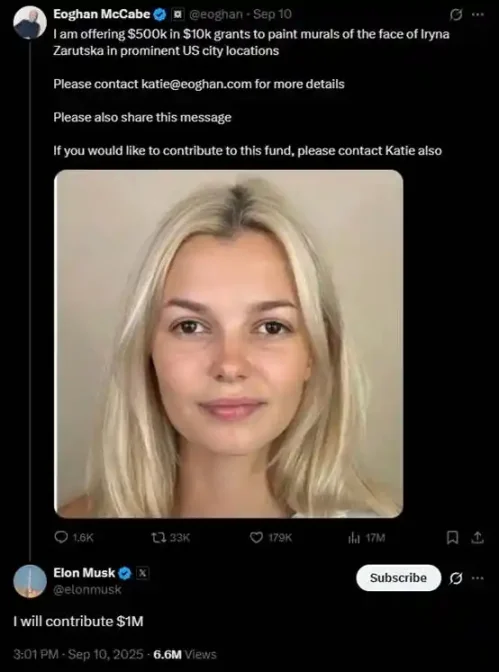 正是在 9 月 10 日的下午 3 点,马斯克在 Twitter 上表示,他愿意捐出 100 万美元,支持在美国主要城市创作 Iryna Zarutska 壁面的激励活动。