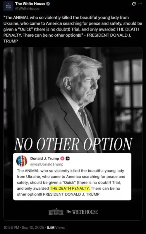 在白宫这条推文后的约 3 小时,Charlie Kirk 遭到了枪击。又过了约 2 小时,川普宣布了 Charlie Kirk 的死讯。