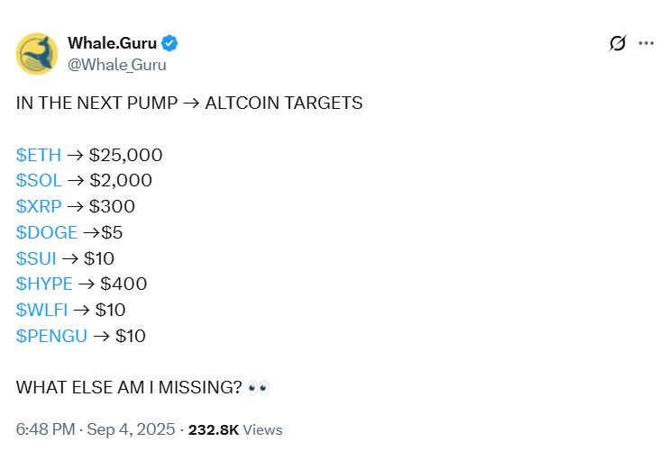 在最新推文中,Whale.Guru公布了下一轮竞争币行情中对多个主流代币的目标价位。其中XRP的预测最为大胆,预计将飙升至300美元。
