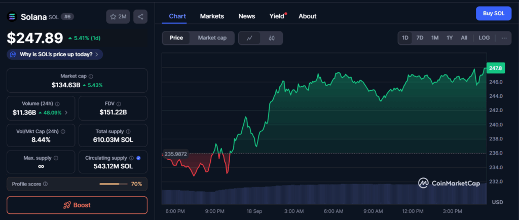 Solana是一个以高扩展性、低手续费和快速交易著称的高性能区块链。通过其原生代币SOL,近期交易时段将该资产推升至247美元上方。该代币从日内235.98美元低点迅速回升,重拾动能并在240美元上方整固后继续上行。
