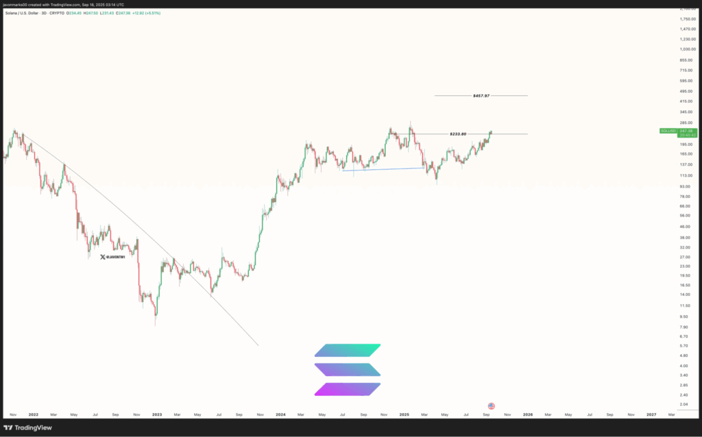 分析师Javon Marks指出,Solana(SOL)在经历2022年长期下跌后稳步回升,现已收复关键价位。图表清晰显示2023-2024年形成的更高低点,当前价格锚定233.80美元,该点位已成为趋势结构标记,构成下一图表目标457.97美元的基础。