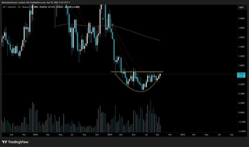 周线图显示OP自2025年4月低点弧形上扬,在长期下跌后构筑圆底基底。该结构反映卖压逐渐衰竭而买盘在更高价位介入,形成筹码积累基础。每次阻力测试都伴随成交量放大,显示突破临界点市场兴趣升温。