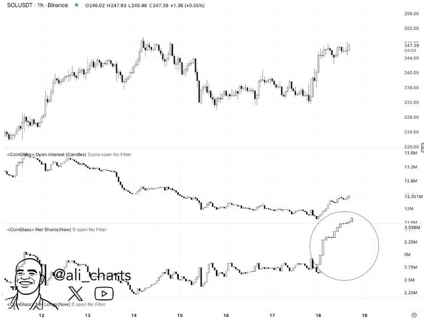 Solana在247美元附近企稳且未平仓合约攀升,为向270美元的潜在轧空行情埋下伏笔。来源:Ali Martinez via X