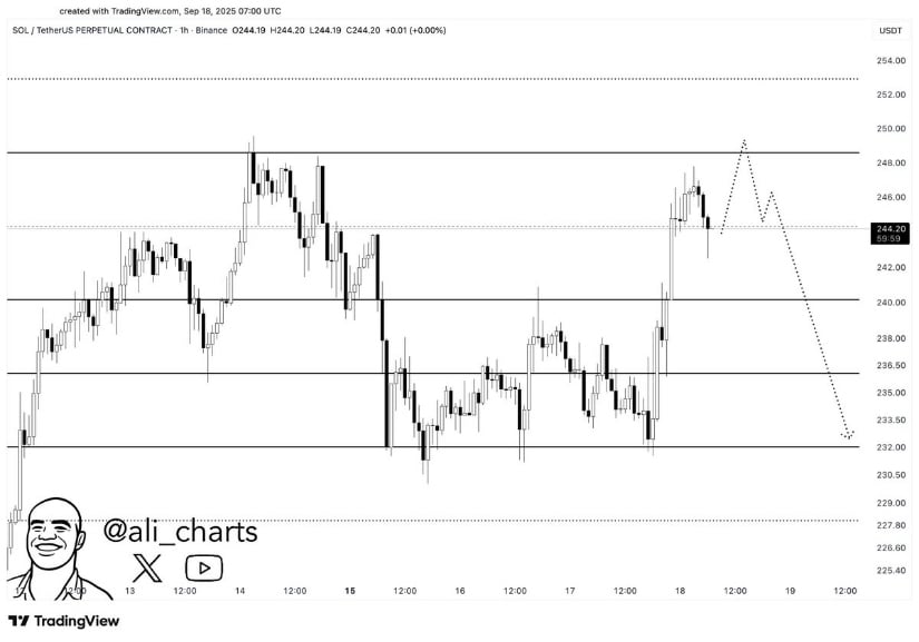 Solana在250美元遇阻,分析师警示下一波决定性行情前可能回撤至230美元。来源:Ali Martinez via X