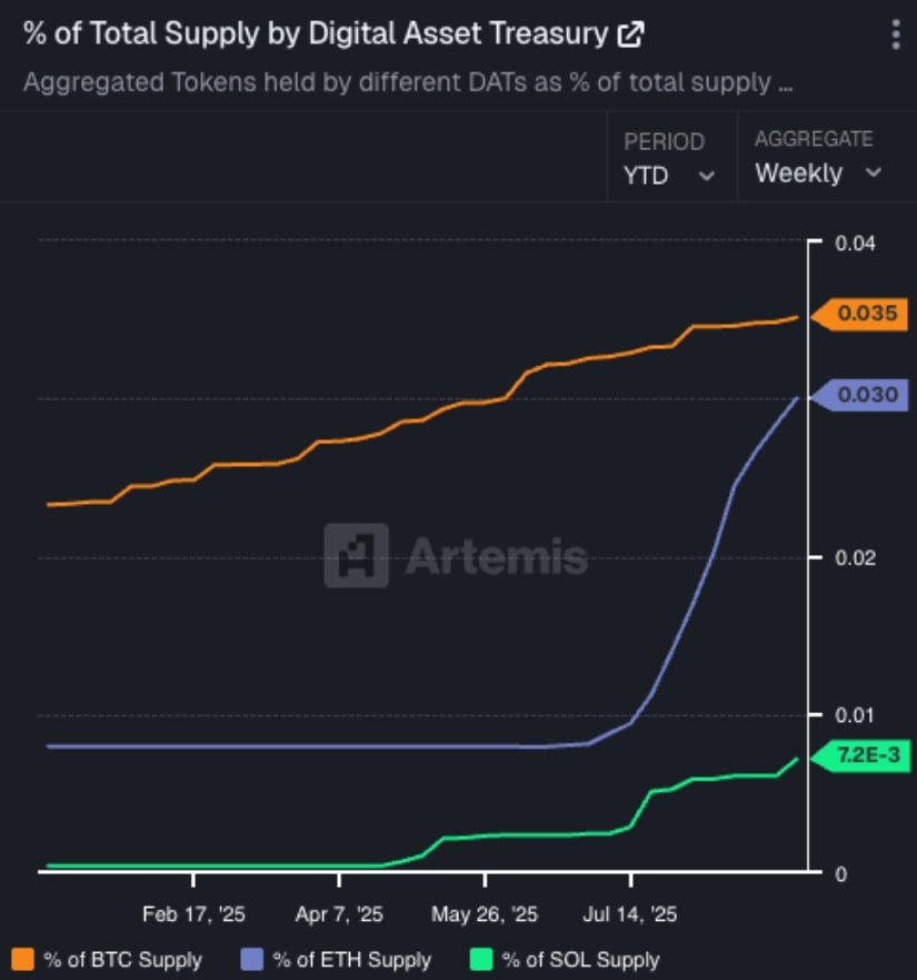 本轮Solana上涨的重要支撑来自机构金库持续增持SOL。Coin Bureau指出,已配置比特币和以太坊的数字资产金库正稳步加仓Solana,使其成为机构持仓前三的加密资产。Artemis图表显示,SOL配置比例自年中以来急剧攀升。