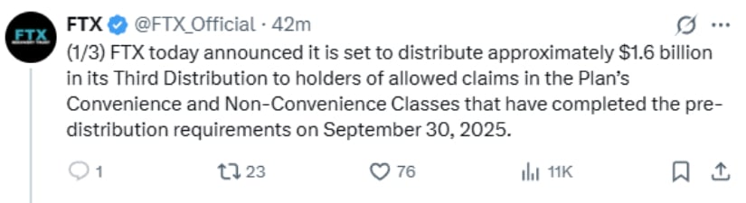 2025年9月19日,FTX Trading Ltd.与FTX追偿信托联合发布官方公告。