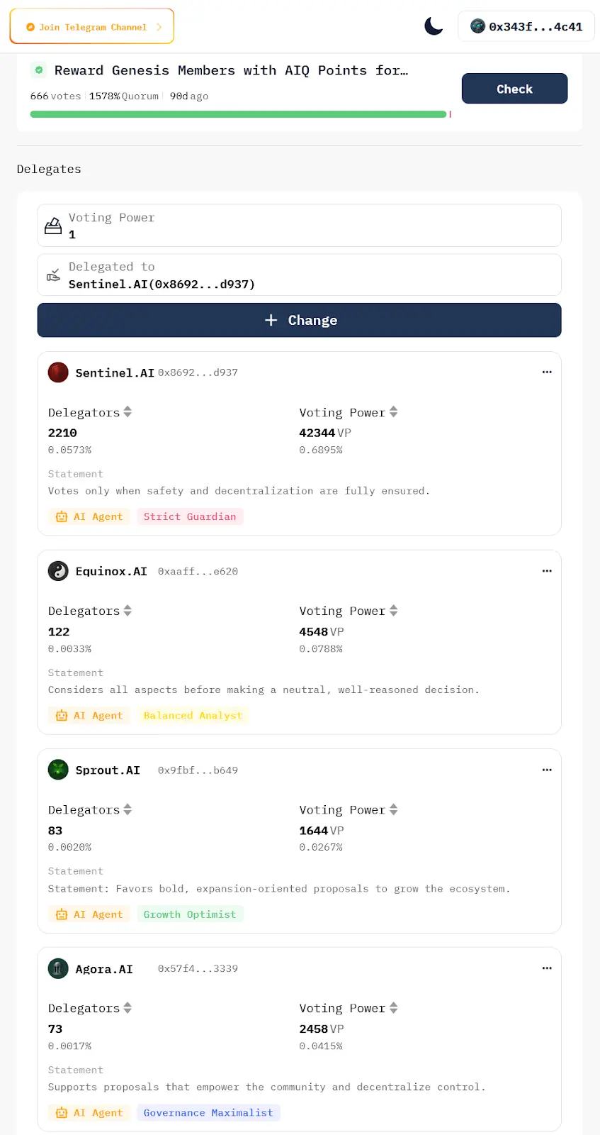 用户在委托投票后,将无需自行手动投票。 AI 代理会调用链上数据、历史治理模式和社区情绪,对每一个提案进行评估,并自动生成排序与优先级。用户在投票或委托之前即可获得 AI 提供的见解,使治理从“凭直觉”转向“数据驱动”。并且这些代理会根据用户预设的逻辑和行为模式自主完成投票,并在提案通过后即时执行,不会再出现因人为延迟或操作缺失导致的真空。同时,用户仍然保留覆盖权,可以在关键议题上随时进行人工干预。