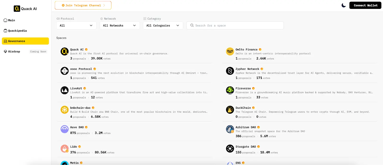 基于其跨链工具组,Quack AI 推出了首个跨链 AI 治理中心,支持社区、DAO 和机构在此与 AI 驱动的治理进行实时交互。它不仅用于参与,还能确保自动执行决策、风险感知投票和财务执行,避免人工瓶颈。