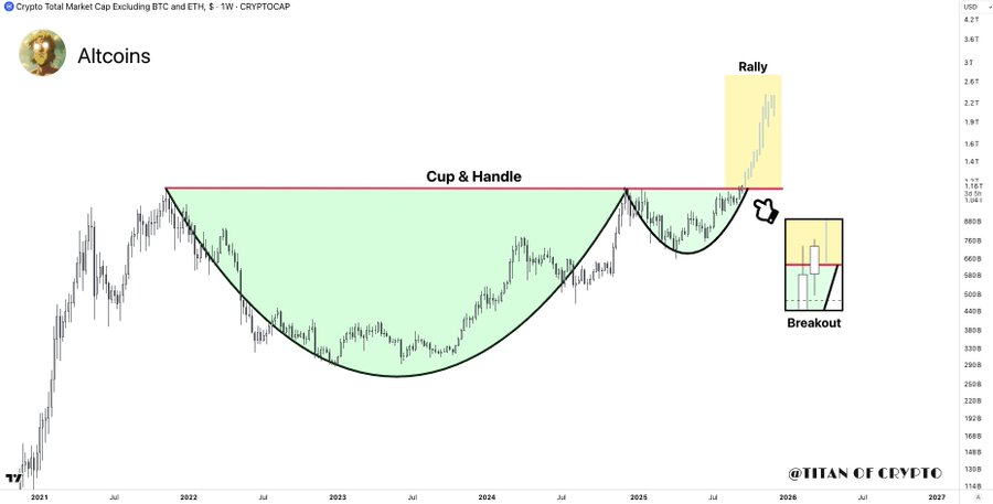 经过数年结构性发展,剔除比特币和以太坊的山寨币总市值已突破关键阻力位。多年周期图表清晰呈现"杯柄形态",标志整合阶段完成。该形态时间跨度从2021年初延续至2025年,最终以确认性突破和上涨收尾。这一转变标志着市场行为发生显著变化,从长期积累阶段过渡到持续增长阶段。
