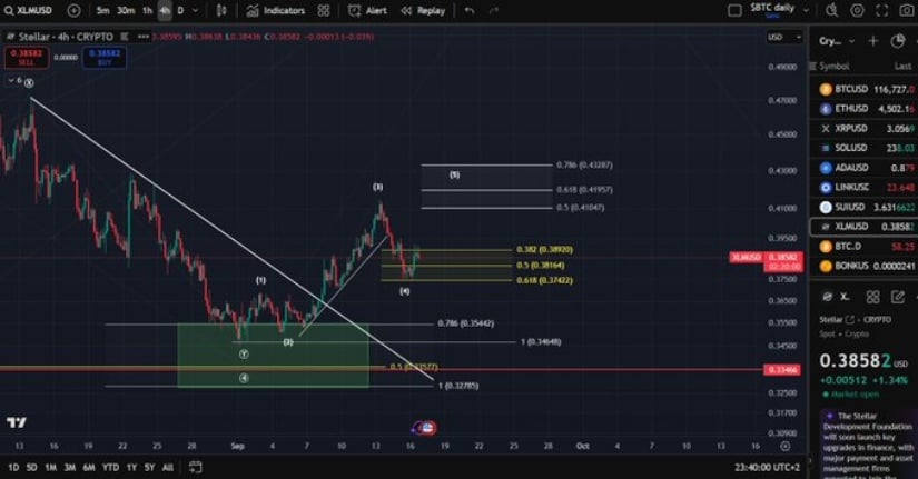 近期某推文中的图表观察指出,恒星币已完成第(4)浪调整,虽直接下行但仍坚守0.374美元的前摆动低点。分析师指出,只要该币价守住此阈值,更宏观的艾略特波浪看涨结构就保持完好,为最终的第(5)浪上行铺平道路。