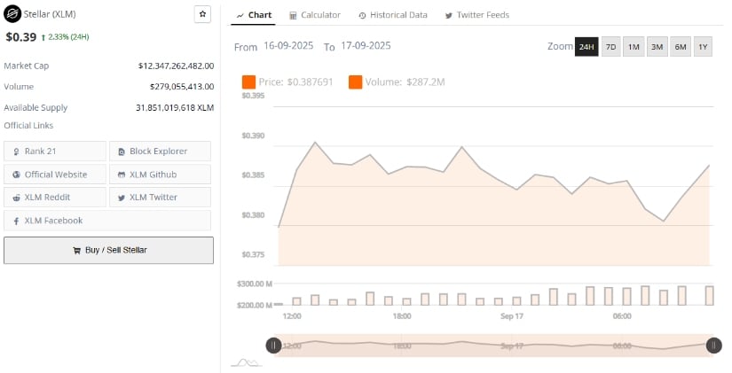 BraveNewCoin数据显示,恒星币现报0.39美元,24小时涨幅2.33%。其市值达123.4亿美元,排名第21位,日交易量2.79亿美元。流通供应量318.5亿枚代币,凸显广泛的市场分布和流动性。