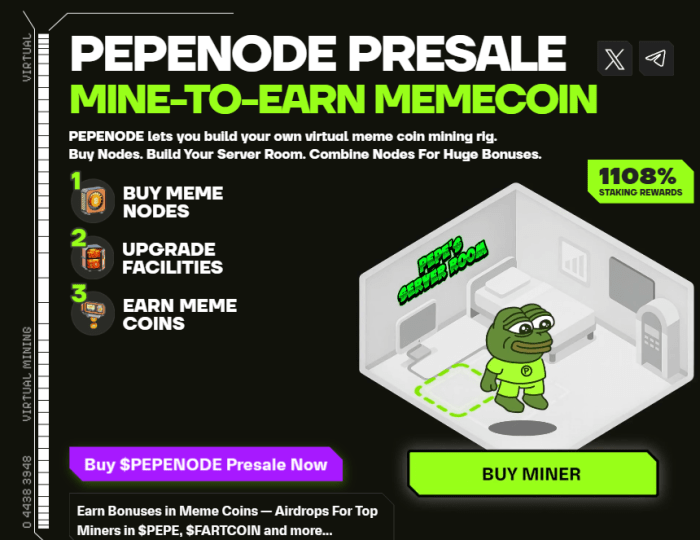 PepeNode ($PEPENODE) 创新性推出"挖矿即收益"机制:购买代币升级虚拟矿机,即可获得$PEPENODE奖励及$PEPE等代币收益。