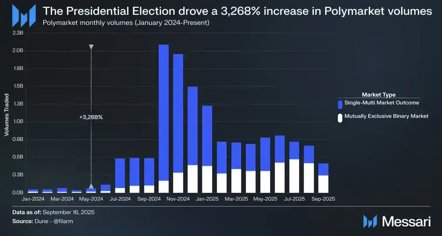 2024 年选举使得 Polymarket 的交易量从 5 月的 6200 万美元飙升至 10 月的 21 亿美元,成长了 3268%。
