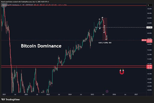 Daan指出山寨币可能迎来疯狂的周期末上涨行情,比特币的市场主导地位或将跌至48-49%水平。他特别强调,若出现该情况,他将主动采取更激进的策略减持山寨币仓位。