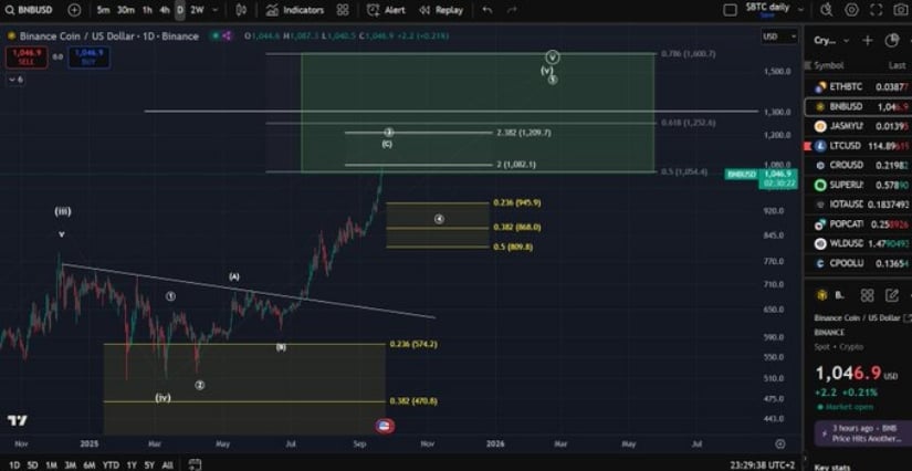 币安币(BNB)坚守1046美元关口,第三浪上涨行情接近尾声