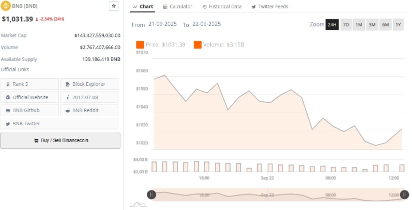 最新数据显示,BNB现报1031.39美元,24小时跌幅2.54%。其市值仍达1434.2亿美元,日交易量27.6亿美元支撑流动性。尽管下跌,BNB仍稳居市值第五大加密货币。