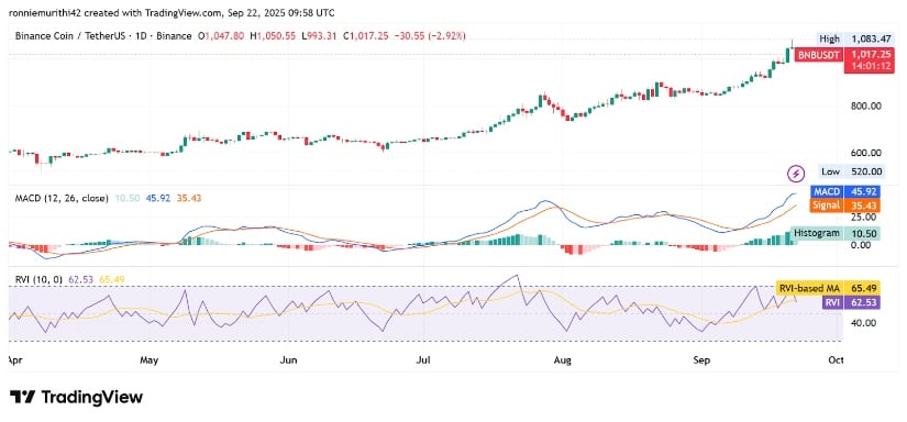 价格走势表明,BNB在周初冲高后进入盘整。交易者正在重新评估短期动能,多头正死守1020美元关键支撑位。若买盘增强,币价或尝试收复1050美元关口,但整体市场环境仍是决定性因素。
