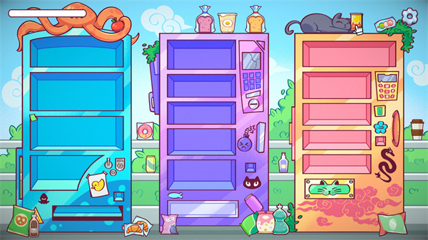 拿起猫粮(带有橙头的黄色罐头)并喂食右侧自动售货机顶部打盹的猫。