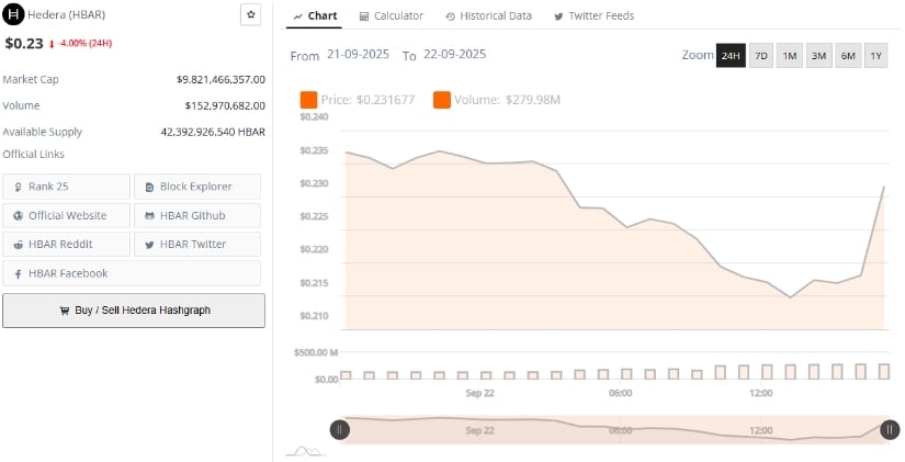 另据BraveNew Coin数据显示,Hedera现报0.23美元,24小时跌幅达4.00%。