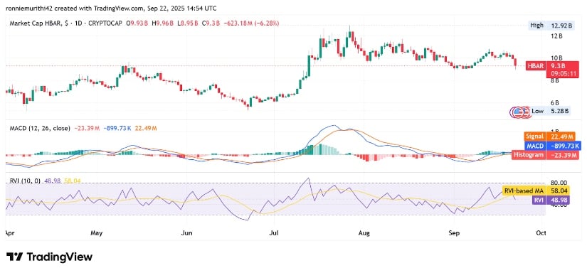 撰稿时,HBAR市值报93亿美元,单日跌幅6.33%。日线图上,代币未能守住百亿美元市值关口,在剧烈回调后逼近局部支撑区。此次下跌发生在长期横盘趋势之后,暗示卖盘加剧且市场情绪转弱。