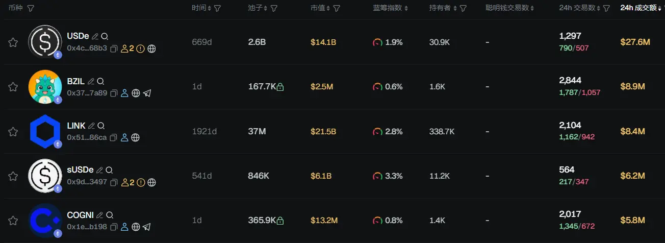 过去 24h ETH 热门代币前五依次为:USDe、BZIL、LINK、sUSDe、COGNI