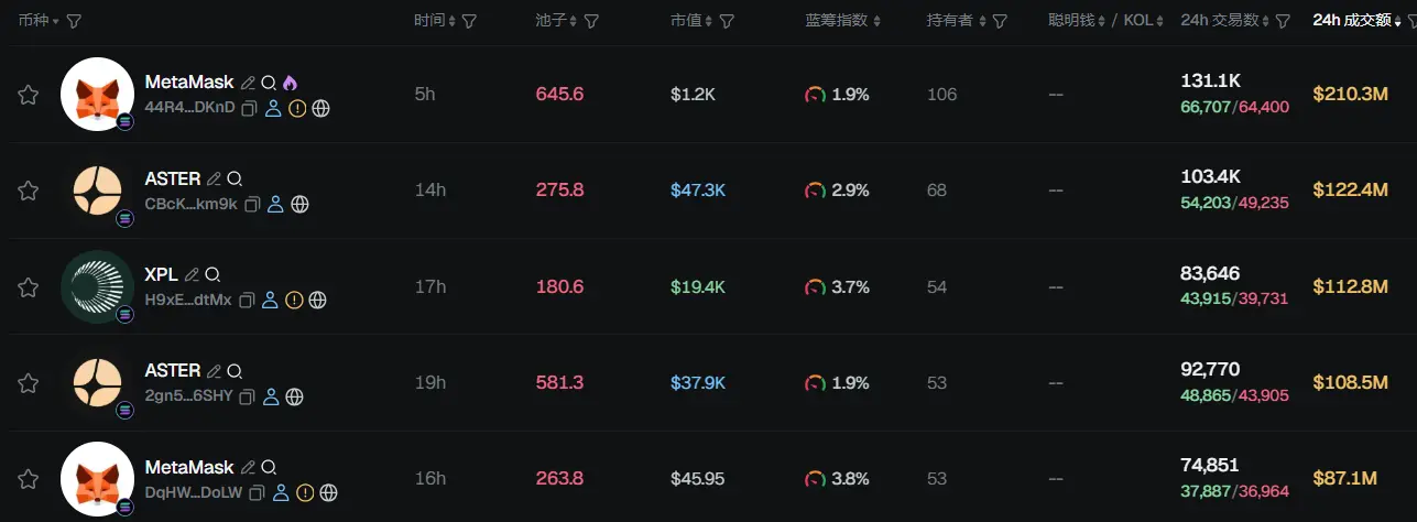 过去 24h Solana 热门代币前五依次为:MetaMask、ASTER、XPL、ASTER、MetaMask