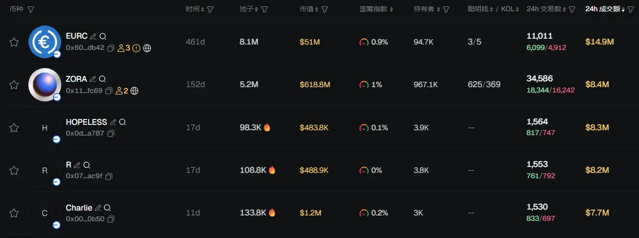 过去 24h Base 热门代币前五依次为:EURC、ZORA、HOPELESS、R、Charlie