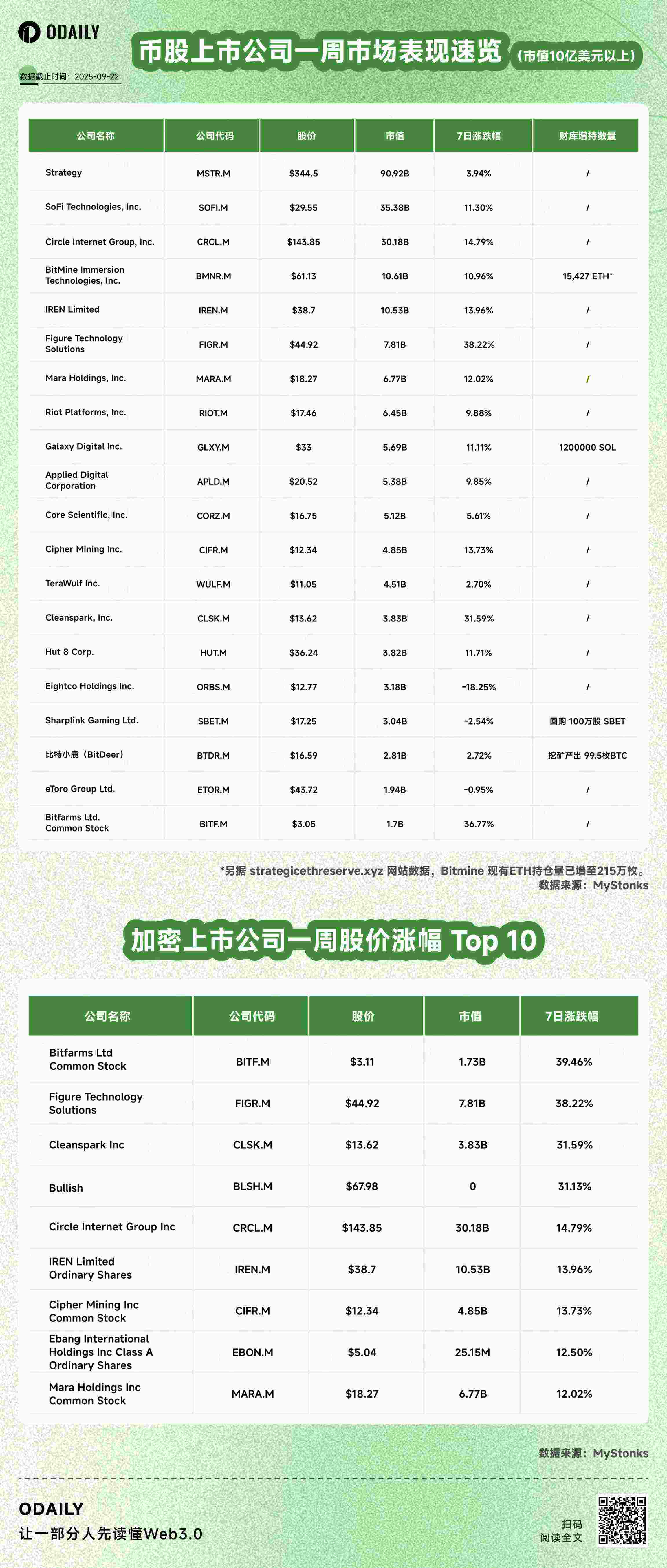 编者按:币股市场逐渐成为加密市场不可或缺的一部分。一方面,诸多上市公司效仿 Strategy 纷纷建立各类加密财库;另一方面,股票代币化运动如火如荼,甚至纳斯达克也计划下场入局。有鉴于此,Odaily星球日报进行了币股市场的周报梳理,根据市场行情及最新消息为读者奉上一份可资参考的《币股指南》, 所有美股数据皆来自 MyStonks ,后续还将持续优化。