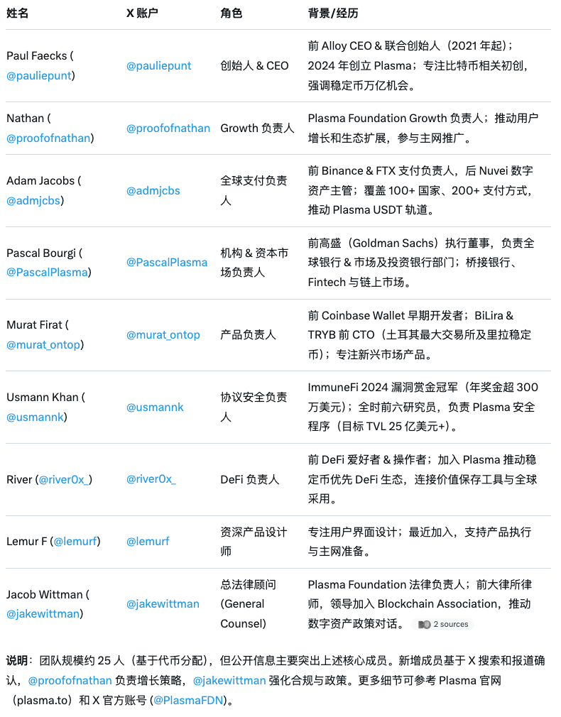 基于现有公开信息,Plasma 团队主要成员如下(Odaily 星球日报结合 Grok 整理):