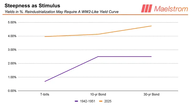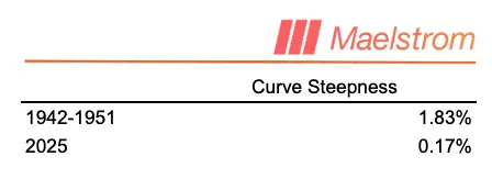 布法罗 ·比尔·贝森特 ( Buffalo Bill Bessent ) 旨在推动美国再工业化,试图延缓 “美利坚治世”从准帝国向纯粹强权民族国家不可避免的衰落进程,这一计划并非新创。二战时期的紧急状况曾让财政部在 1942 至 1951 年间接管美联储。贝森特方案的部分内容涉及收益率曲线重塑,即收益率曲线调控。该时期的收益率曲线形态与当今相比有何异同?