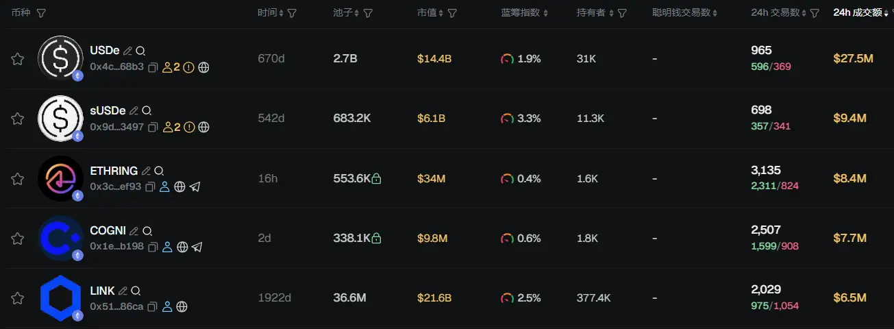 过去 24h ETH 热门代币前五依次为:USDe、sUSDe、ETHRING、COGNI、LINK