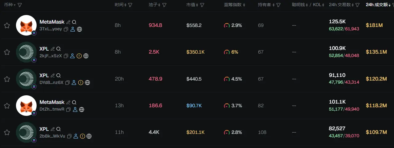 过去 24h Solana 热门代币前五依次为:MetaMask、XPL、XPLK、MetaMask、XPL