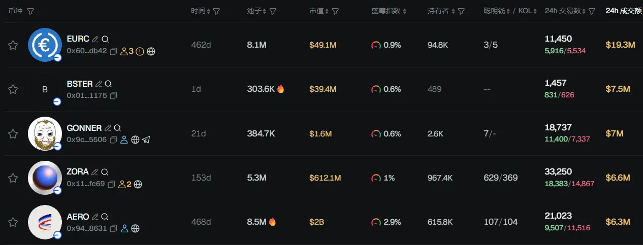 过去 24h Base 热门代币前五依次为:EURC、BSTER、GONNER、ZORA、AERO