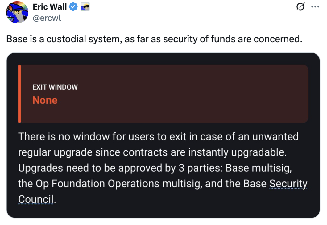 Vitalik 观点中认为 Base 中心化排序器是为了可扩展性和使用者体验也引发了大量的争议。Taproot Wizards 联合创始人 Eric Wall 表示,就资金安全而言,Base 就是一个託管系统,并指出 Base 的合约仍然可以通过治理进行升级,这意味着营运商及其相关实体(通过安全委员会)保留了相当大的自由裁量权。在他看来,这使得 Base 在功能上更接近于託管系统,而不是完全信任最小化以太坊扩展。Eric Wall 还在评论区表示,Vitalik 发表观点的措辞会让读者认为即使出现密钥洩漏也不会导致资金损失,如此表达很不负责任。